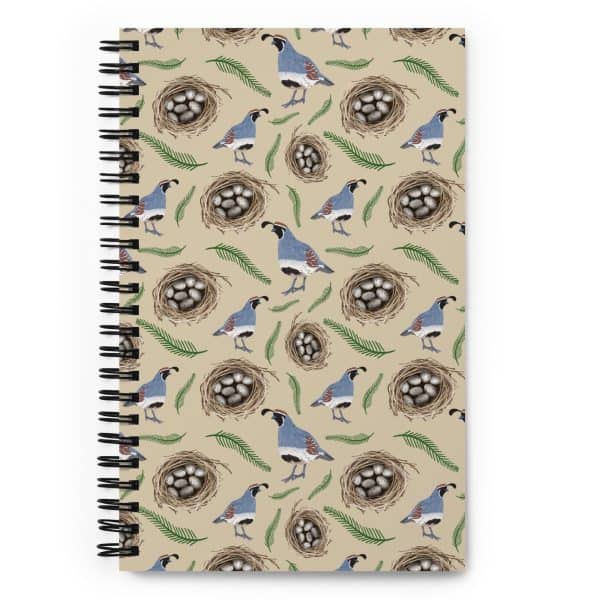 This bird pattern notebook features hand-drawn Gambel’s quail walking between nests with speckled eggs on a tan background. I drew these after realizing I could identify quail by their topknot bobbing between the bushes (they start feeling like friends after approximately 400 sightings).