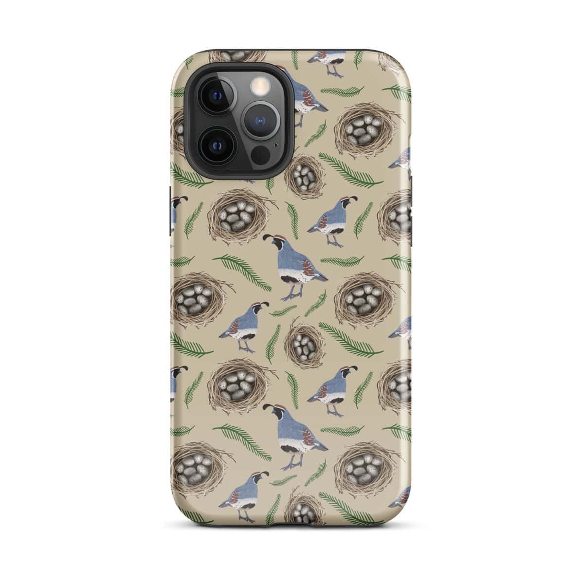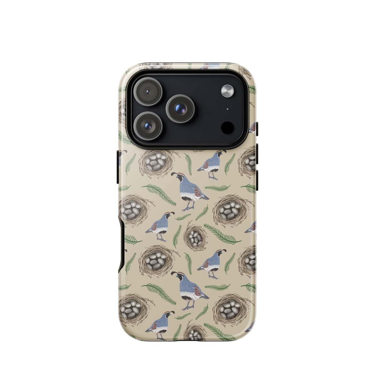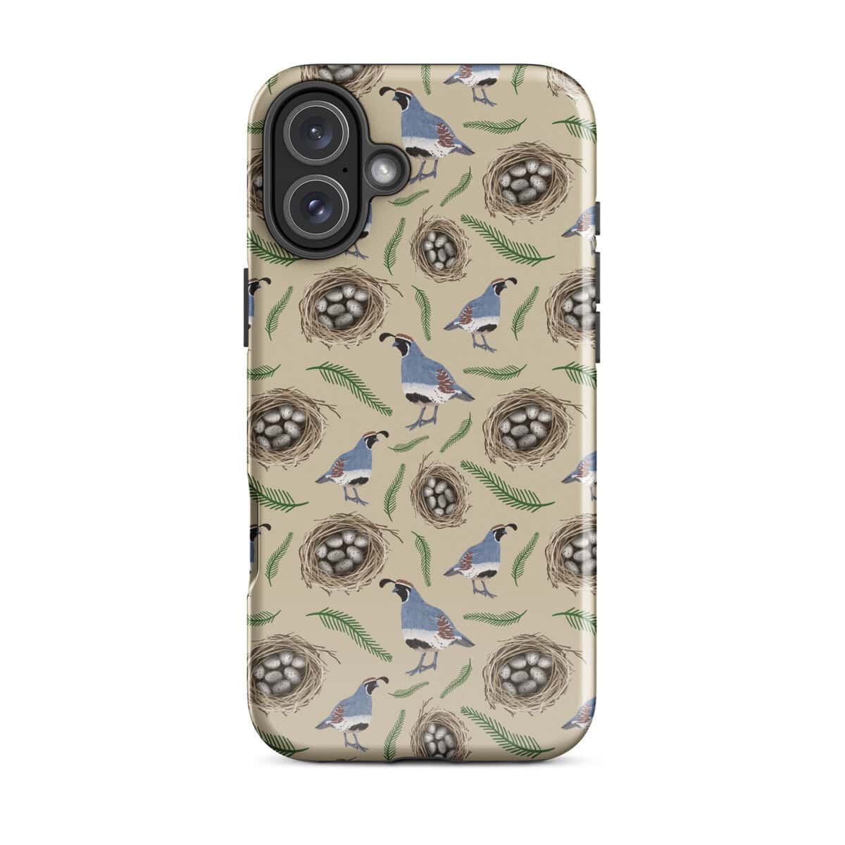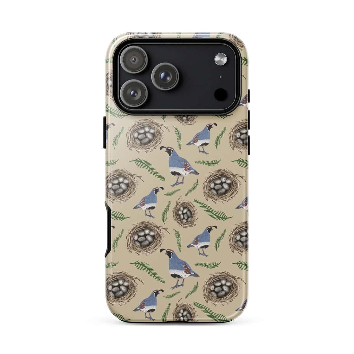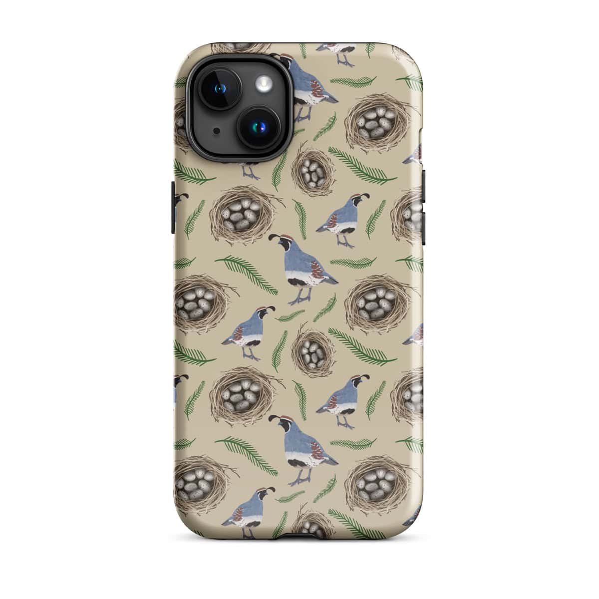 This bird pattern phone case features hand-drawn Gambel’s quail walking between nests on a sand-colored background. I drew these after spending years in Tucson watching quail families cross streets in perfect single-file lines (adults in front, approximately fourteen chicks following behind, one straggler bringing up the rear).