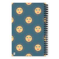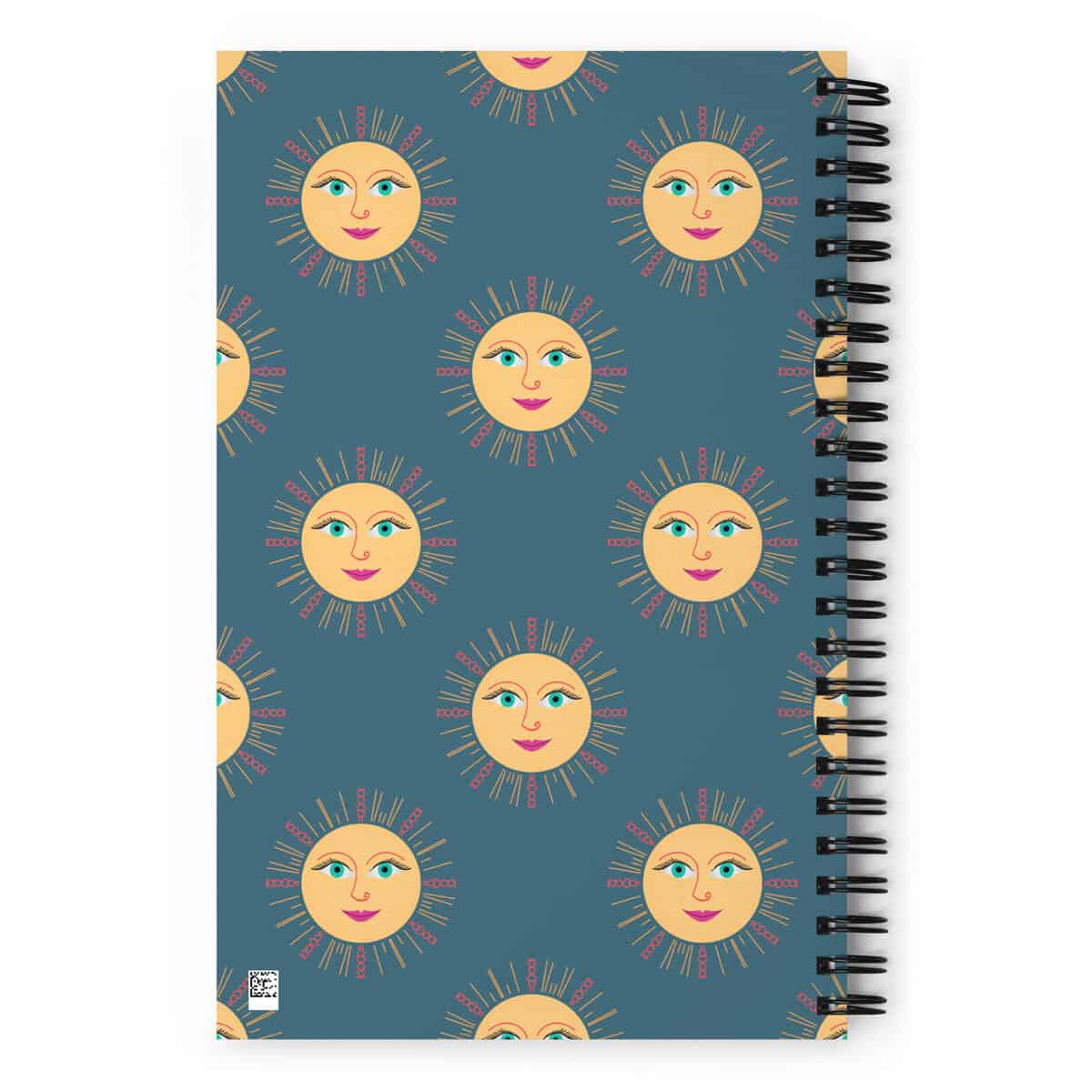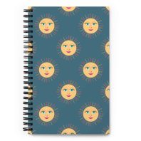 This celestial spiral notebook features hand-drawn golden suns with faces on a desert blue background. I drew these after noticing everyone in Arizona has this thing where they’ll complain about the sun for nine months straight and then immediately miss it when they travel anywhere else.