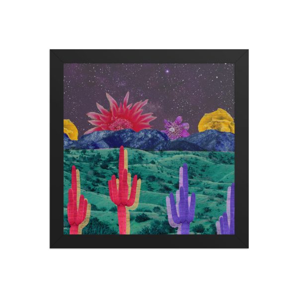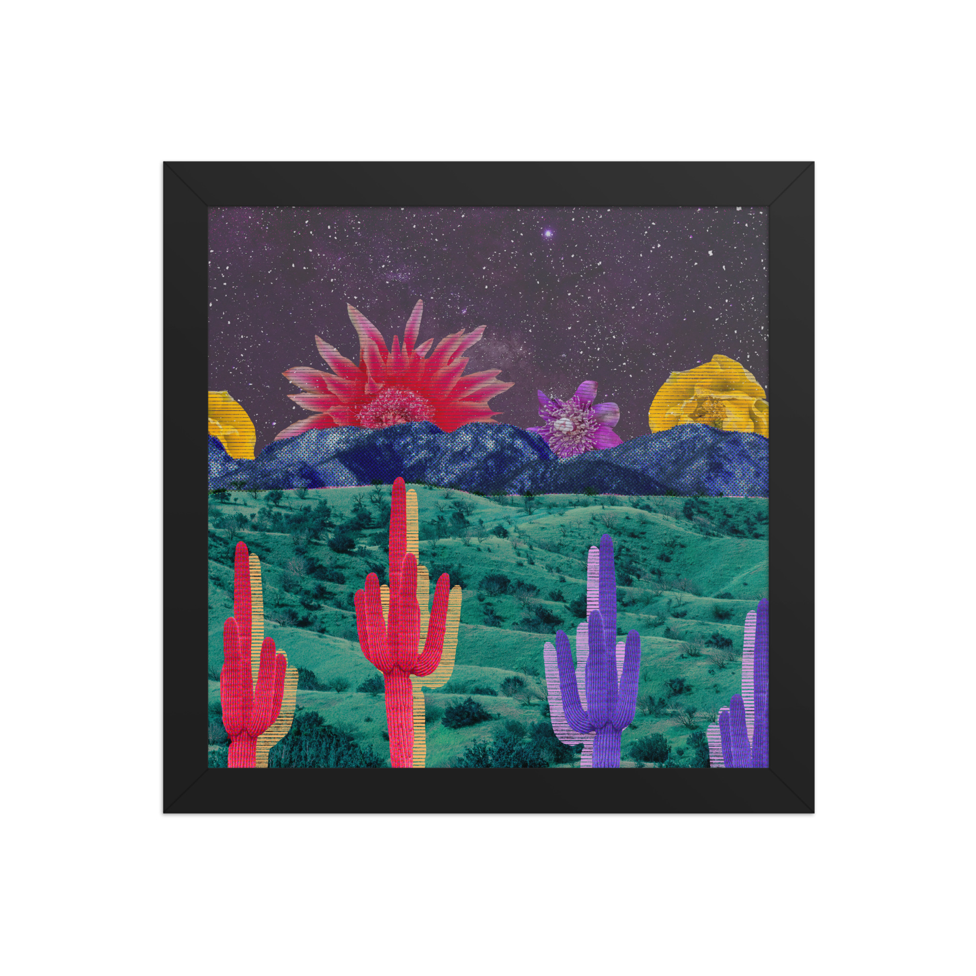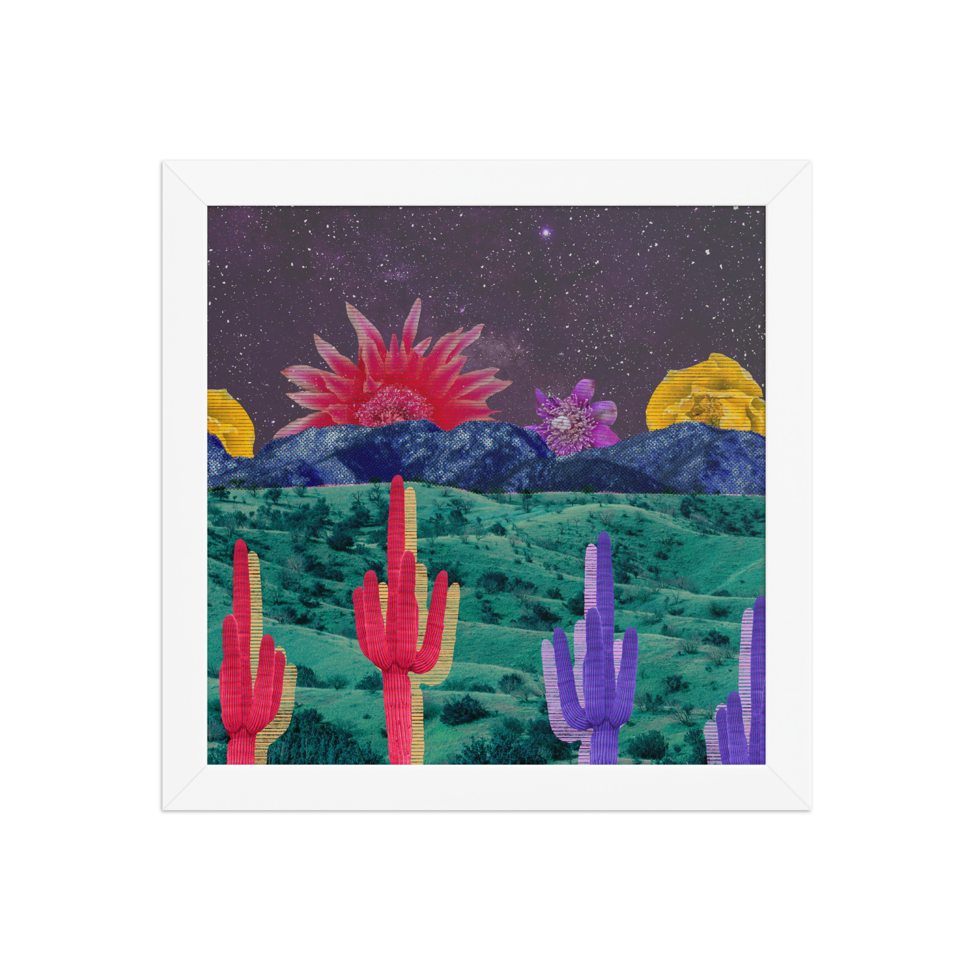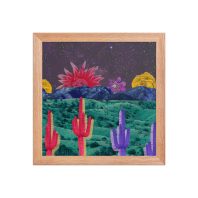 The collage features striped cacti in red, yellow, and purple against teal grasslands, blue mountains, and a starry sky with oversized desert flowers.