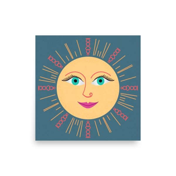 This midcentury modern sun art print features a yellow sun with turquoise eyes, pink lips, and decorative swirls in coral and orange rays against a blue-gray background. Inspired by living in Arizona, where the sun is less of a weather element and more of a daily presence you have to plan around.