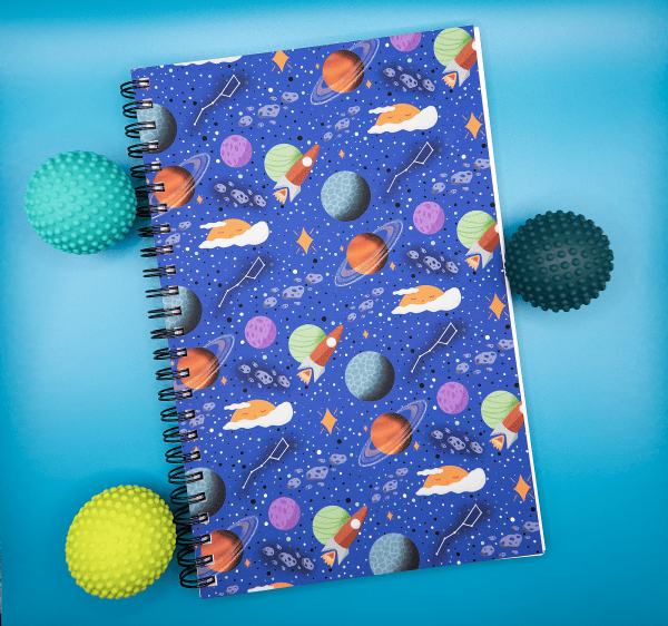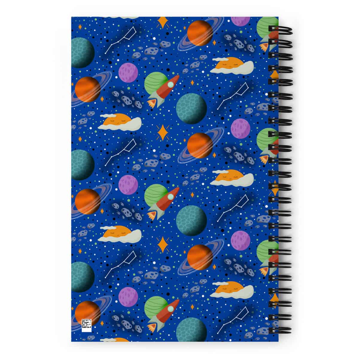 Take your notes somewhere new. Colorful planets, retro rockets, and sleepy suns cover the front, inspired by stargazing nights in southern Arizona.