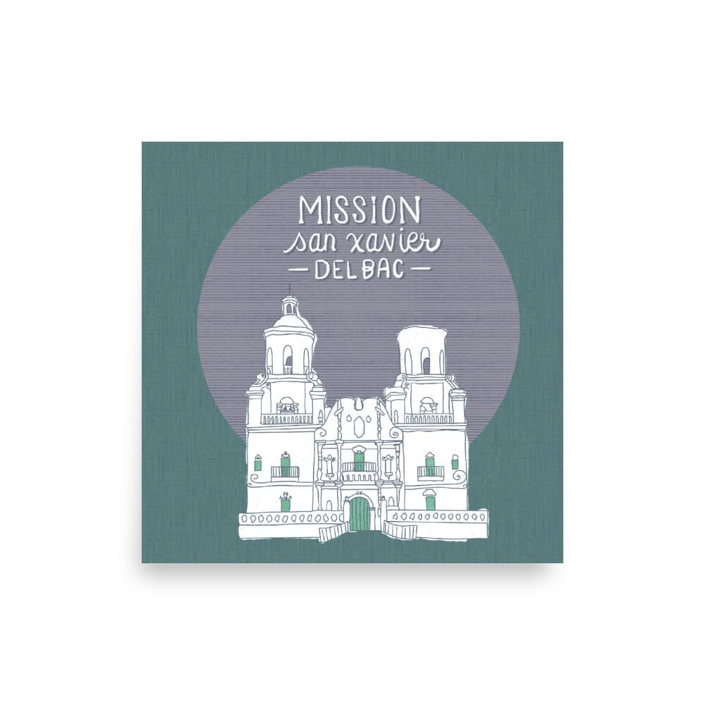 This Mission San Xavier Tucson architecture art print features hand-lettered text and hand-drawn illustration of Mission San Xavier del Bac, the White Dove of the Desert. The mission sits in a gray circle against a teal textured background, with white line work and green accents on the doors and windows.